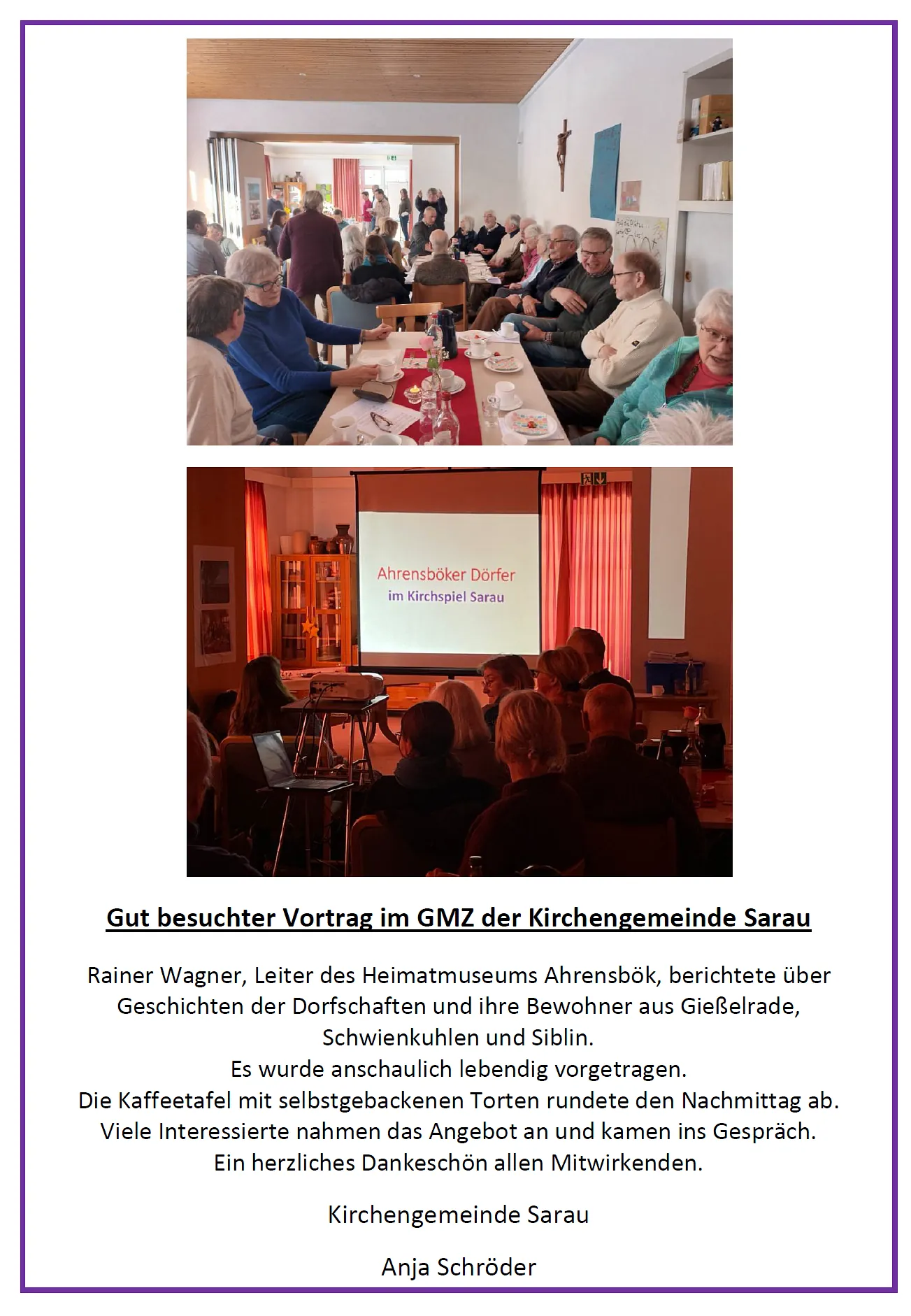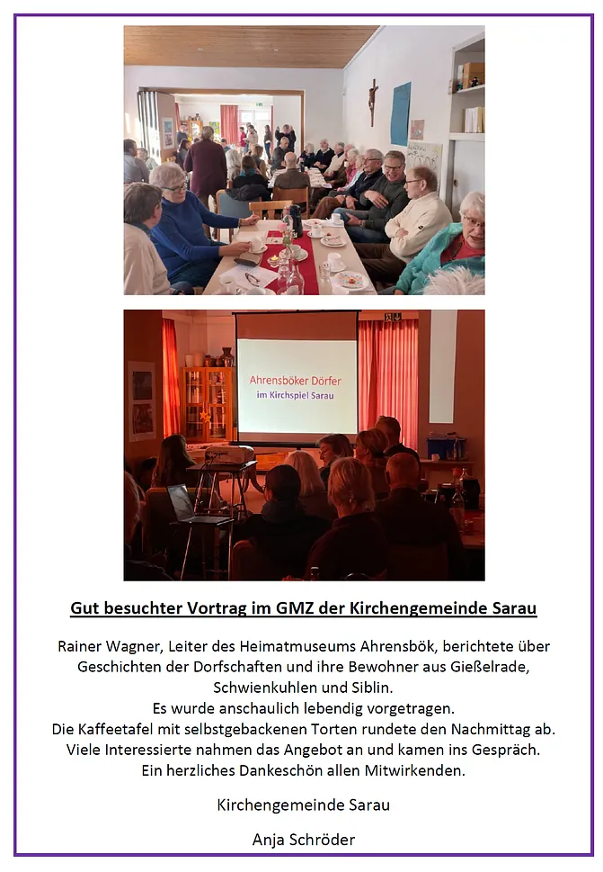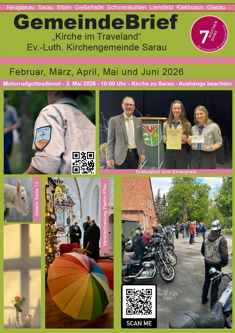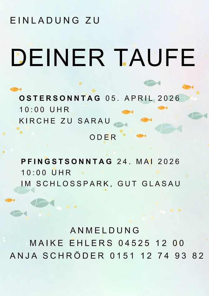 Die Kirchengemeinde Sarau hat etwa 900 Mitglieder, die in den Orten Sarau, Glasau, Neuglasau, Siblin, Gießelrade, Schwienkuhlen, Kiekbusch und Liensfeld wohnen. Es erwartet Sie ein vielfältiges Gemeindeleben. Schauen Sie sich gerne auf unserer Internetseite um und lernen Sie die Kirchengemeinde Sarau kennen.