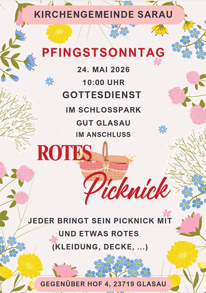 Am Pfingstsonntag lädt die Kirchengemeinde Sarau nach dem Gottesdienst zu einem "roten Picknick" im Schlosspark von Gut Glasau ein. Jeder bringt sein Picknick mit und eine rote Decke oder rote Kleidung. Das Picknick soll eine Feier für den Ehrenamtstag sein, der am Samstag davor begangen wird.